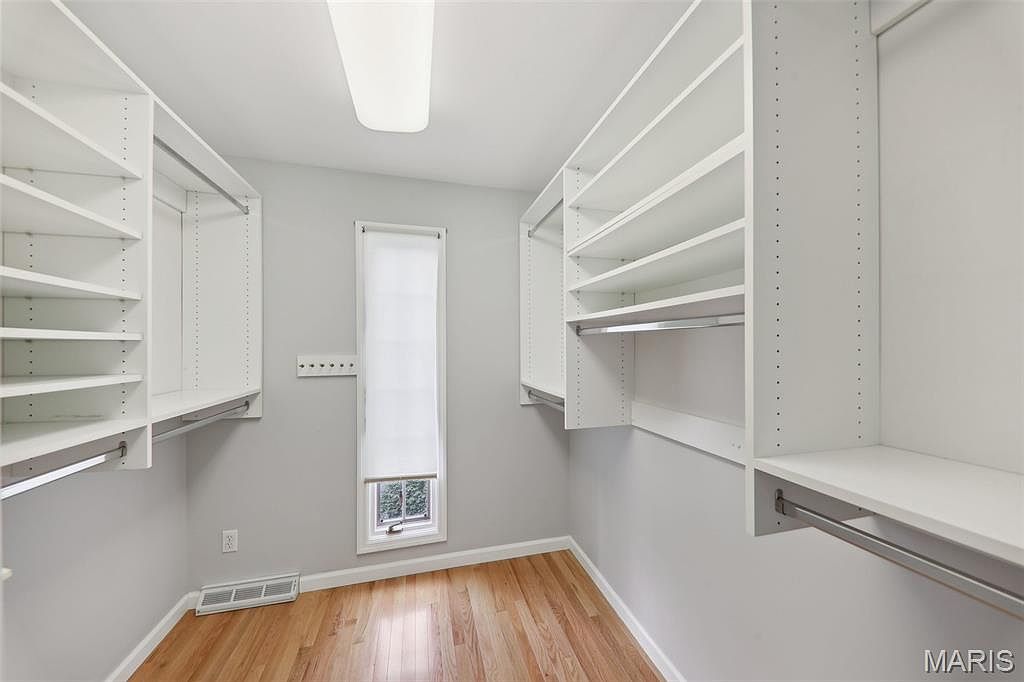 This walk-in closet features an organized, functional design with ample white shelving units and hanging rods on both sides, offering extensive storage options for clothing and accessories. The narrow, rectangular layout highlights a single window at the far end, outfitted with a light-filtering shade, allowing natural light to softly illuminate the space. The walls are painted a soft gray, complementing the warm tone of the hardwood floor, creating a clean and modern aesthetic. The overhead fluorescent light fixture provides bright, even illumination, emphasizing the efficient and minimalist style of this storage area.