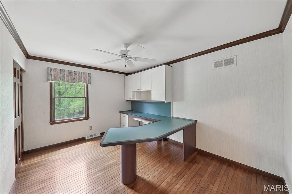 This compact, functional home office or nook features a built-in L-shaped desk with teal countertops and white storage cabinets above, offering a practical workspace. The walls are adorned with subtle, neutral-toned wallpaper, complemented by medium-tone wood trim and baseboards that frame the room elegantly. The hardwood floor adds warmth and texture, creating a cozy yet productive atmosphere. A single window with a modest valance lets in natural light and provides views of greenery outside. The ceiling fan with light enhances airflow and illumination, balancing comfort with classic design elements throughout the space.