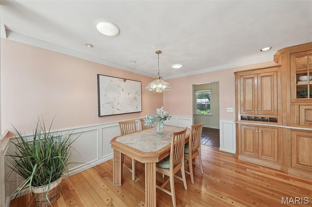 This dining area combines warmth and simplicity, featuring honey-toned hardwood floors that extend seamlessly across the space. The walls are painted a soft blush, enhanced by classic white wainscoting that adds elegant texture and contrast. A sturdy wooden dining table with a light granite inset top anchors the room, surrounded by four matching wooden chairs with cushioned seats in muted green. Above hangs a vintage-style glass chandelier, emanating warm, inviting light. On one side, built-in cabinetry offers ample storage and display space, crafted from light wood that complements the floors. A corner plant adds a touch of natural greenery.