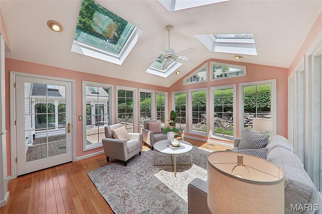 This sunroom features an inviting, airy layout accented by large floor-to-ceiling windows and multiple skylights that flood the space with natural light. The walls are painted a soft peachy pink that adds warmth and a subtle pop of color, complementing the warm honey-toned hardwood flooring. Furnished with two gray armchairs and a matching sectional sofa, arranged around a round white marble coffee table with a minimalist gold frame, the space promotes relaxation and conversation. A patterned area rug anchors the seating zone, while a white ceiling fan and recessed lighting offer both comfort and functionality. The French door leads out to a brick-paved patio, integrating indoor and outdoor living seamlessly.