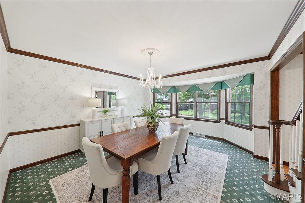 The dining area features a rectangular wooden table accompanied by six upholstered chairs in a soft, neutral fabric, positioned atop a light patterned rug that contrasts with the green carpet beneath. The walls are adorned with light wallpaper displaying subtle floral designs, highlighted by dark wood trim that creates a refined frame around the room. Natural light floods in from a series of multiple-pane bay windows dressed with green and white triangular valances. A classic chandelier with crystal accents hangs overhead, adding a touch of elegance, while a white cabinet with lamps and a mirror completes the cozy yet polished atmosphere.