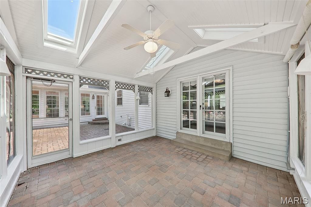 This bright sunroom features a vaulted ceiling painted white, enhancing the airy, open feel. Exposed beams accentuate the ceiling height, while skylights allow natural light to flood the space. The floor is laid with earthy-toned bricks, adding warmth and rustic charm. Large glass windows and doors with white trim create seamless visual and physical access to an outdoor brick patio, inviting indoor-outdoor living. A white ceiling fan provides air circulation, complementing the light, neutral palette. The French doors with small steps lead back into the home, promoting easy flow between indoor and outdoor relaxation areas.