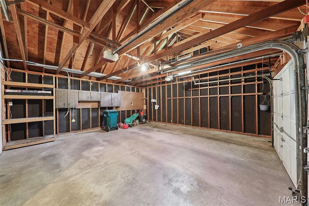 This spacious garage opens with a large, white sectional door on the right, supported by exposed metal tracks and an automatic opener hanging from the ceiling. The walls reveal raw wooden framing and black insulation, adding a rustic, unfinished aesthetic to the space. Shelving and cabinetry along the far wall provide ample storage, with practical items such as a green trash bin, garden tools, and a gas can neatly arranged on the concrete floor. The ceiling’s prominent wooden trusses showcase craftsmanship, with electrical wiring and light fixtures suspended to illuminate the entire area. The overall atmosphere reflects functionality blended with industrial charm, offering plenty of room for vehicles and workshop needs.