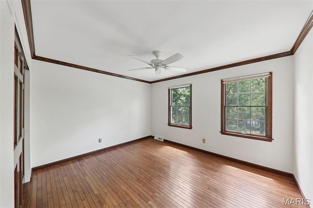 This bright bedroom features a simple and clean design with white walls and warm, medium-toned hardwood floors that run throughout the space. The room is framed by dark wood trim along the baseboards, window frames, and crown molding, providing an elegant contrast to the white walls. Two large windows allow natural light to fill the room, creating an inviting atmosphere and showcasing views of lush greenery outside. A white ceiling fan hangs centrally, adding functionality and subtle charm to the otherwise minimalist layout, ready to accommodate various furniture arrangements.