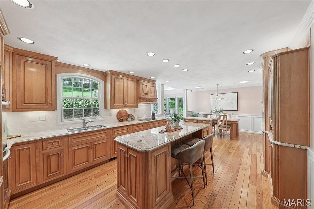 This spacious kitchen features warm-toned wooden cabinetry that extends the length of the room, paired with matching hardwood floors for a cohesive, inviting look. A large central island with a granite countertop offers additional workspace and seating with plush stools. Underneath the island, detailed wood paneling complements the cabinets, enhancing the traditional style. The white tile backsplash and light walls brighten the space, reflecting natural light coming through the arched window above the double sink. Beyond the kitchen, a formal dining area with wood chairs and a simple chandelier creates a comfortable transition for entertaining and daily meals.