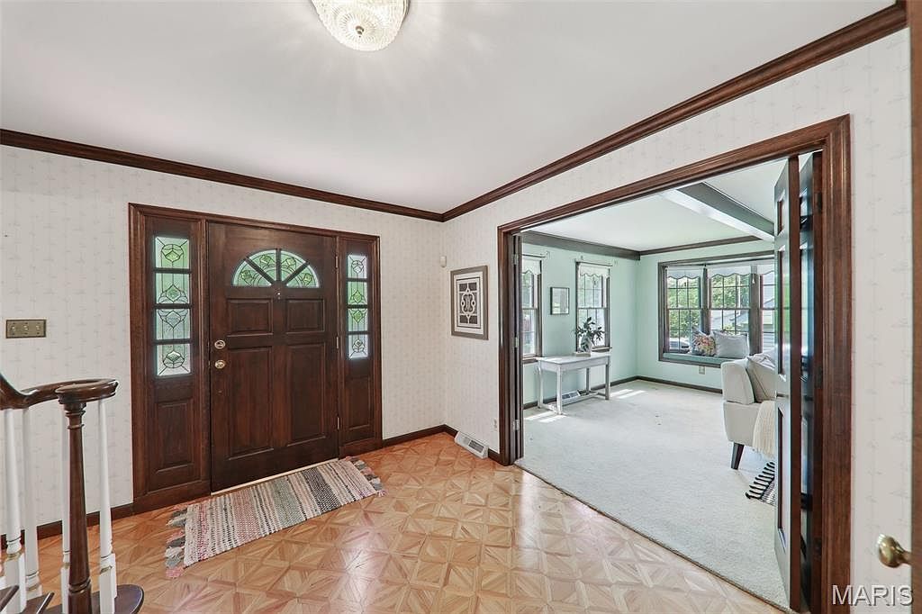 This inviting entryway features a rich, dark wood front door accented with decorative stained glass panels that allow natural light to filter in softly. The floor showcases a polished parquet pattern, adding warmth and texture, complemented by a neutral woven rug near the entrance. White walls with subtle patterned wallpaper contrast with dark wood crown molding and door trim, creating a classic and elegant look. To the right, an open doorway with double wood doors leads into a bright living room, painted in a soft pastel blue with white trim and large windows that flood the space with daylight, highlighting cozy seating and refined decorative details.