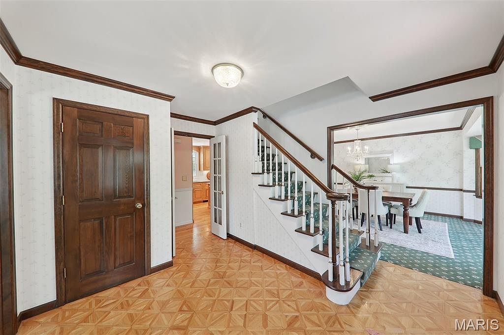 This welcoming entry hall features warm wood tones with a polished parquet floor arranged in a geometric pattern, complementing the dark wood door and trim that bring a classic elegance. The staircase, accented with white balusters and dark wood handrails, rises gracefully, carpeted in a muted green with a subtle motif that matches the adjacent dining room carpet. Walls are adorned with light wallpaper featuring a delicate, understated pattern, maintaining a soft and airy atmosphere. A traditional flush-mount ceiling light brightens the corridor, while the opening to the dining area offers an inviting glimpse of formal living space.