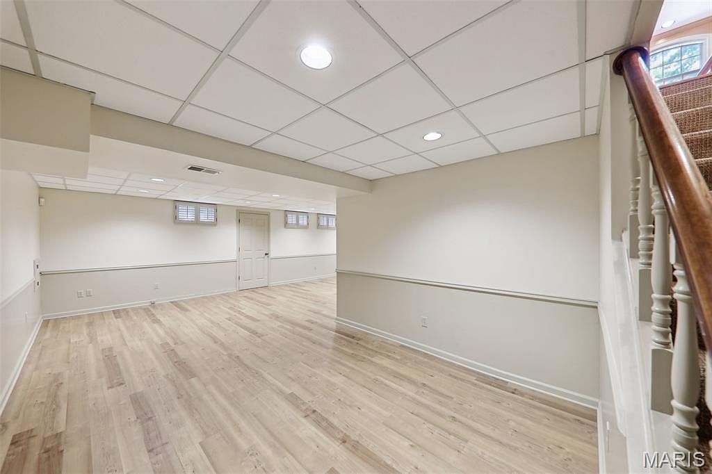 This spacious basement recreation area features a clean, modern aesthetic with light beige walls and white trim that enhances brightness. The flooring consists of light-colored wood planks, creating a warm and inviting atmosphere. A drop ceiling with recessed lighting evenly illuminates the space, while small rectangular windows near the top of the far wall provide subtle natural light. The white door at the end of the room offers access to another section of the basement or storage space. The carpeted stair banister with white spindles adds a classic touch to the entryway.
