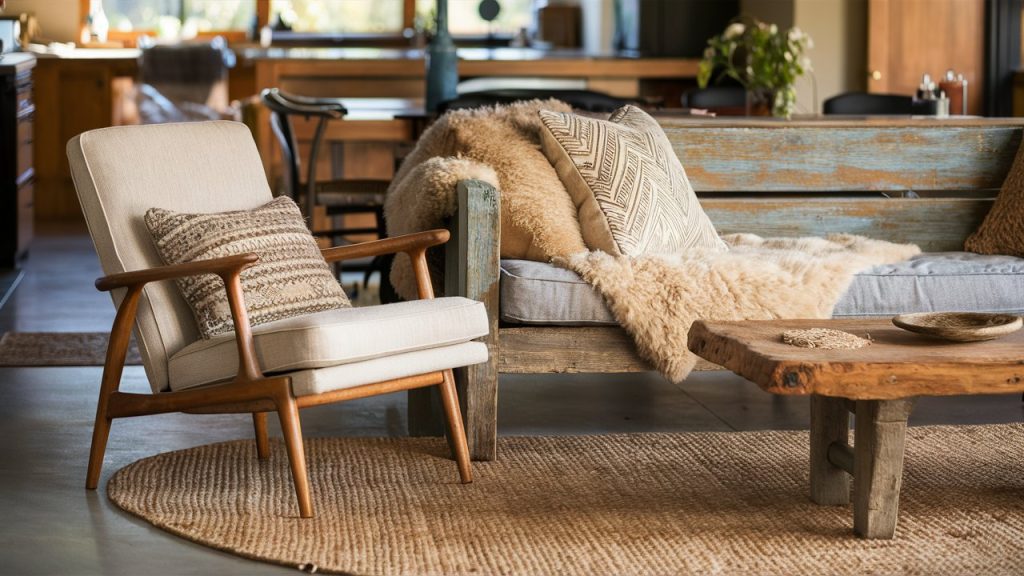 Pairing a mid-century lounge chair with a rustic wooden bench blends structure with texture. The bench adds warmth and organic charm, while the chair keeps things sleek and tailored. This combination works especially well in entryways or open-concept living rooms where eclectic touches shine. Layering in cozy textiles like a sheepskin throw or patterned pillow can help unify the styles.