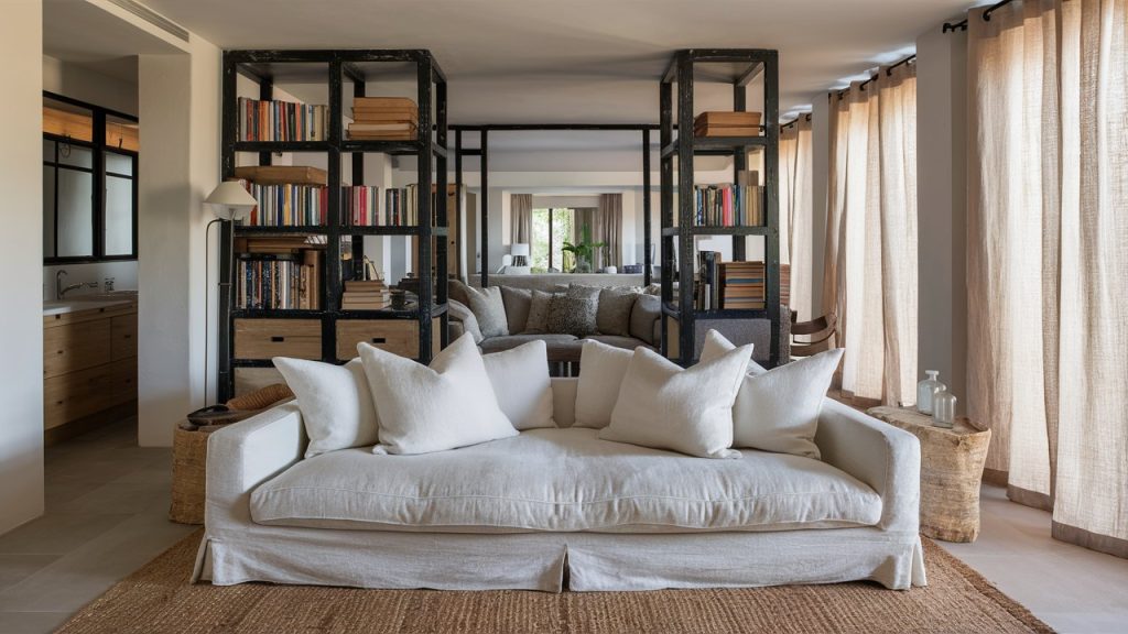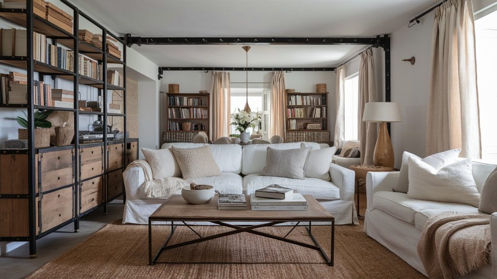The rugged lines of an industrial-style bookcase pair surprisingly well with the relaxed vibe of a coastal slipcovered sofa. Together, they create a room that’s both laid-back and edgy. This pairing works best in neutral color palettes with natural textures like linen, jute, and aged metal. Balance the look with layered lighting and soft, oversized cushions.
