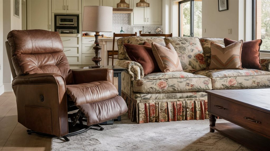 A rugged leather recliner paired with a traditional, floral skirted sofa is a bold but cozy mix. It plays with masculine and feminine styles, offering visual variety while maintaining comfort. To keep the look cohesive, coordinate accent pillows or throws in similar hues. This works great in family rooms where both style and practicality matter and where lived-in warmth is the goal.