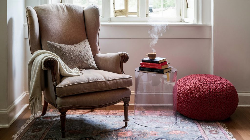 The bold mix of a transparent Lucite table and a traditional wingback chair adds depth and dimension. The airy modern table makes the heavier vintage piece feel less bulky, while still providing function. This unexpected duo is perfect for reading nooks or bedroom corners. A shared accent color—like a throw pillow or rug—can make them feel like they were meant to be together.