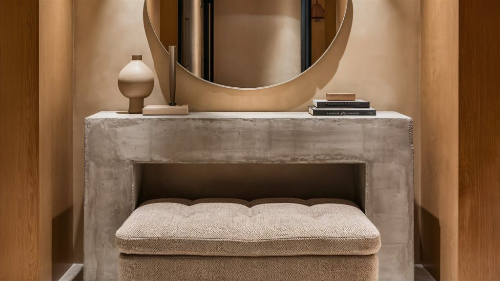The hard, modern edge of a concrete console pairs beautifully with a plush, fabric-covered bench. This duo works well in entryways or hallways where form meets function. The key is balancing the weighty feel of concrete with soft textures and warm tones. Add a mirror or art piece above to elevate the vignette and make the contrast feel purposeful and chic.