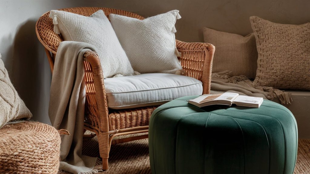 Velvet and wicker might seem worlds apart, but they complement each other beautifully. The softness of velvet contrasts with the natural, airy vibe of wicker, creating a tactile, layered effect. Place the ottoman as a coffee table or footrest next to the chair for a cozy nook. Stick with earthy or jewel tones to enhance the blend of luxury and casual comfort in the space.