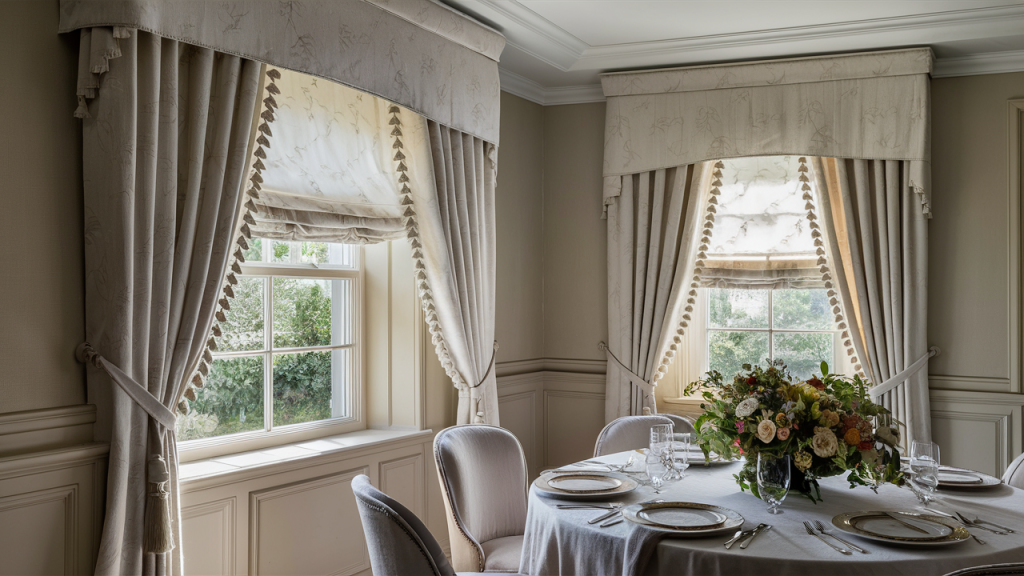 For a polished and traditional aesthetic, cornices and valances provide a tailored frame for your windows. A structured cornice in wood or upholstered fabric lends architectural detail, while a flowing valance softens the space with elegance. These features can hide curtain rods and add a finished look, making them a great option for both formal dining rooms and cozy bedrooms seeking a timeless touch.