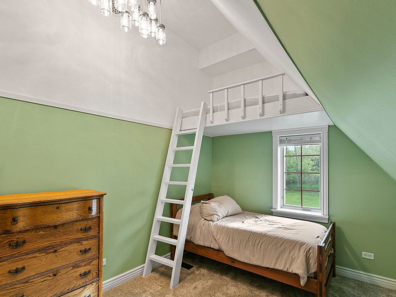 This bedroom features a clever use of space with a single bed positioned under a white loft bed accessible by a short ladder. The walls are painted a soothing sage green on the lower two-thirds, contrasting with bright white above, creating a fresh and airy atmosphere. A large window with white trim brings natural light and provides a pleasant view of greenery outside. The room includes a sturdy wooden dresser with ornate handles that adds warmth and a touch of traditional charm. Plush carpeting underfoot enhances the cozy, inviting feel of this compact sleeping space.