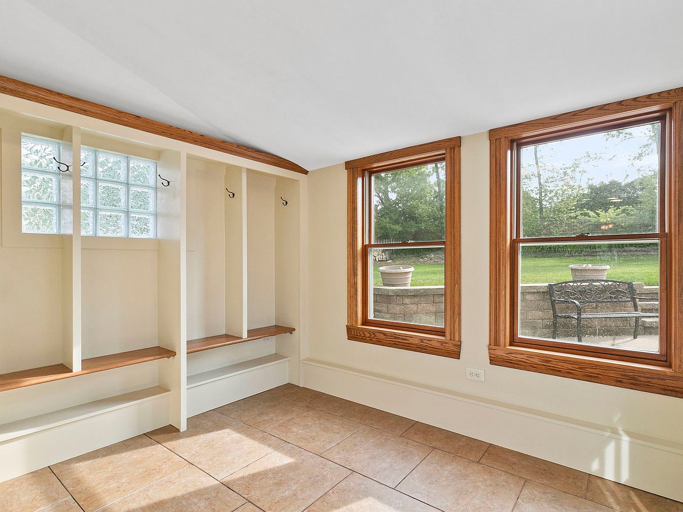This well-lit mudroom features custom built-in cubbies with wooden benches and hooks for organizing coats, bags, and shoes. The cream-colored walls combine with natural wood trim around the two large windows, creating a warm, inviting atmosphere. The windows offer a view of the lush greenery outside and allow ample natural light to fill the tiled floor area. Above one set of cubbies, frosted glass blocks add an interesting architectural detail, softening the light while maintaining privacy. The neutral tones and functional layout emphasize utility blended with subtle rustic charm.