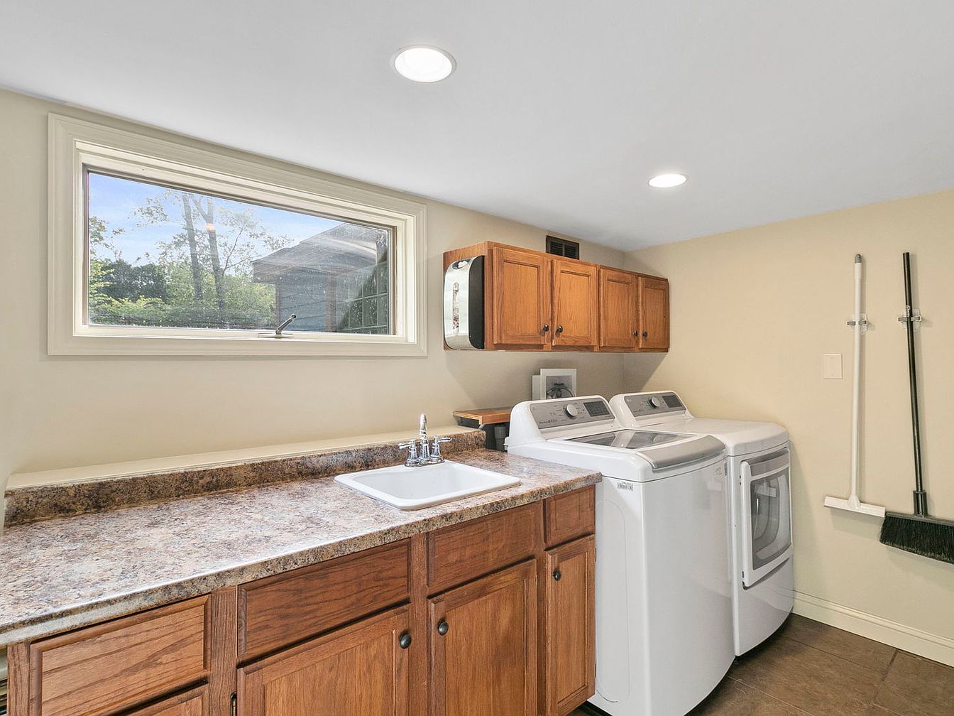 This functional laundry room features a practical layout with a set of white, modern washing and drying machines placed side by side against a beige wall. Above the machines, wood-finished cabinetry offers ample storage space, matching the lower cabinetry beneath a generously sized granite countertop. The countertop houses a clean, white built-in sink with a chrome faucet, ideal for handwashing and other utility tasks. Natural light floods the space through a large horizontal window framed in white, highlighting the warm wood tones and neutral color palette. Mounted cleaning tools on the wall add to the room’s organized efficiency.