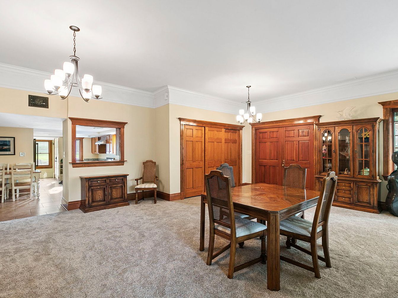This dining room features warm wooden accents with rich cherry-toned doors, trim, and furniture that create a classic and inviting atmosphere. A medium wood dining table with four cushioned chairs anchors the space, complemented by an elegant china cabinet displaying collectibles near the window. The beige walls and plush neutral-toned carpet enhance warmth, contrasted by bright white crown molding and ceiling that add architectural interest and brightness. Two sophisticated multi-light chandeliers provide balanced lighting. An interior window overlooking the kitchen brings openness and connectivity to the home’s layout while maintaining a cozy ambiance.