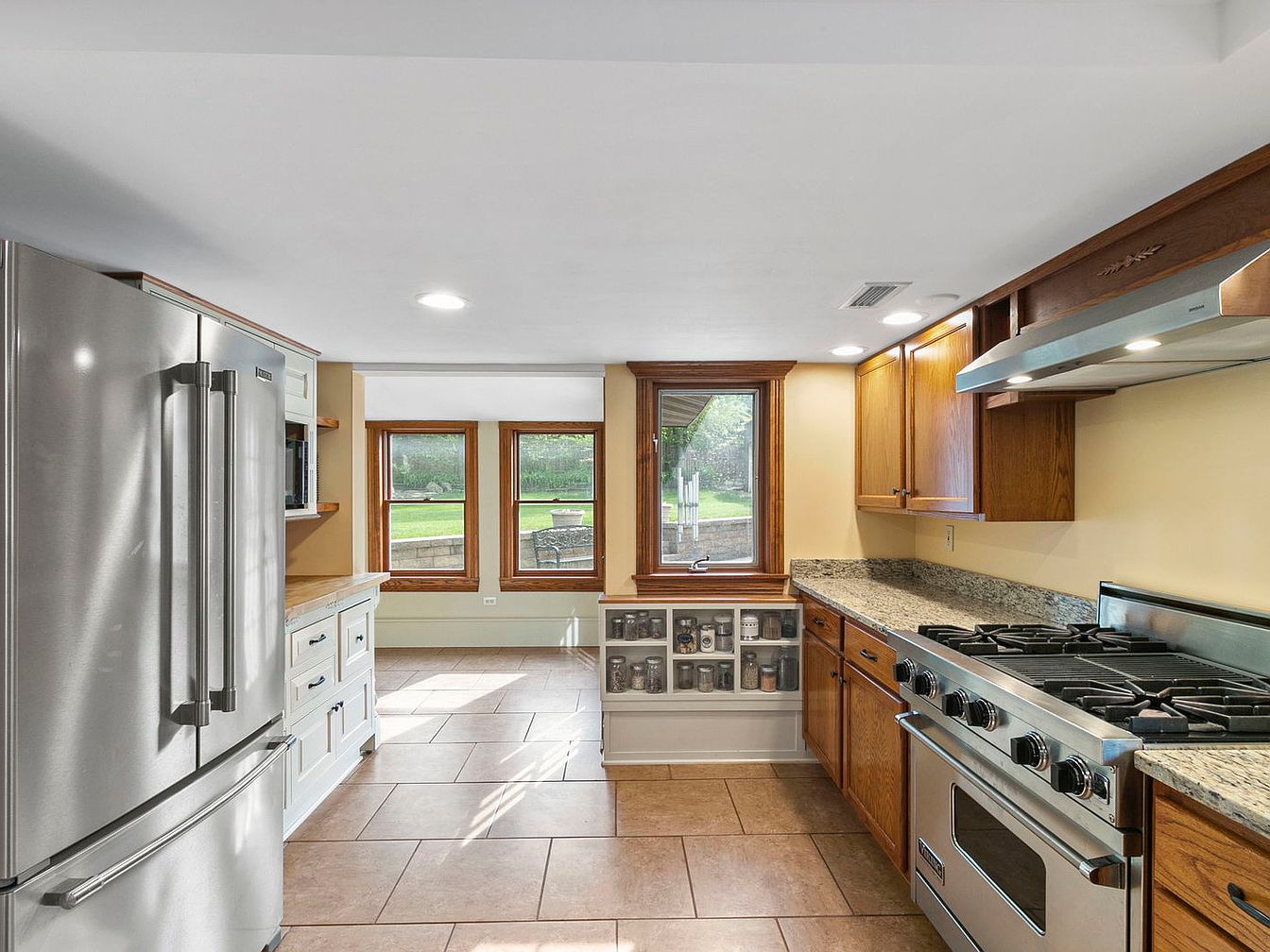 This bright kitchen features a practical galley layout with a long granite countertop on one side and ample cabinetry in warm wood tones. Modern stainless steel appliances include a large French door refrigerator and a professional-grade gas stove paired with a sleek hood vent. A small built-in shelf beneath the window holds jars for easy access to spices, adding a functional touch. Natural light floods the space through three wooden-framed windows overlooking a green backyard, highlighting the neutral beige walls and large light brown ceramic floor tiles that tie the room together with a cozy, inviting ambiance.