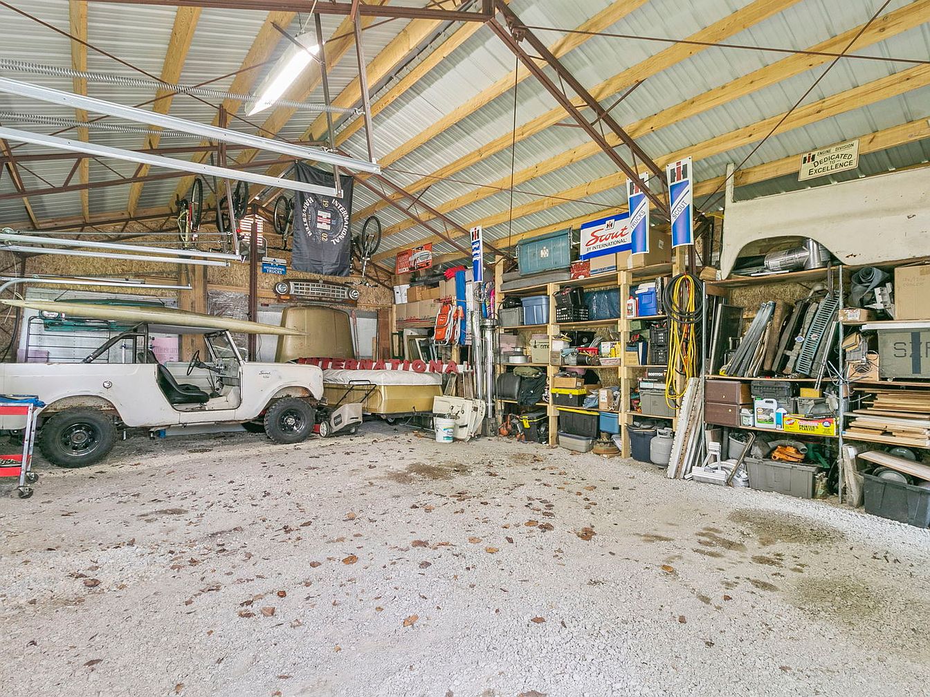 This spacious garage blends functionality with a rustic, utilitarian charm. The floor is unpaved, covered with a layer of gravel and scattered debris that emphasizes its use for heavy-duty activities. Exposed wooden beams support the metal roof, highlighting the industrial style ceiling structure. Storage is maximized with open shelving units along the back and right walls, filled with assorted tools, supplies, and vintage vehicle parts. A classic white off-road vehicle stands prominently, complemented by hanging bicycles and automotive memorabilia, including nostalgic International Harvester signs, giving this space a personalized, workshop vibe rich in character.