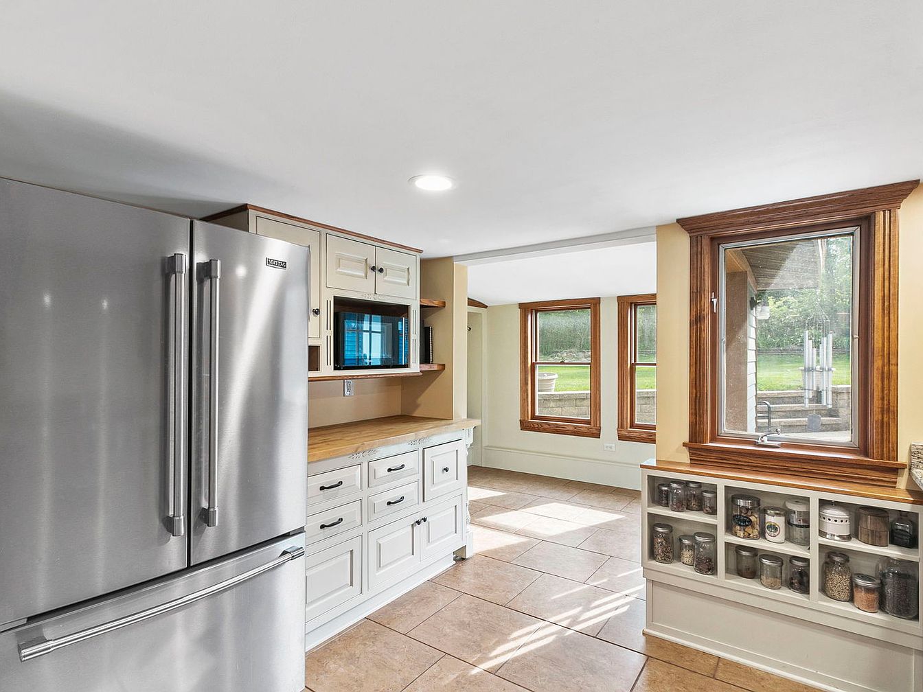 This kitchen area features a sleek stainless steel French door refrigerator paired with classic white cabinetry adorned with dark metal handles and knobs. The wooden countertop adds warmth to the space, contrasting gently with the neutral beige walls and large ceramic floor tiles. A built-in microwave is neatly positioned within upper cabinets, while open wood shelves offer additional storage and display space. Bright natural light floods in through three large, well-trimmed windows with rich wooden frames, creating a welcoming atmosphere. An adjoining shelf unit with neatly organized glass jars hints at thoughtful pantry storage and accessibility, blending function with a homey aesthetic.