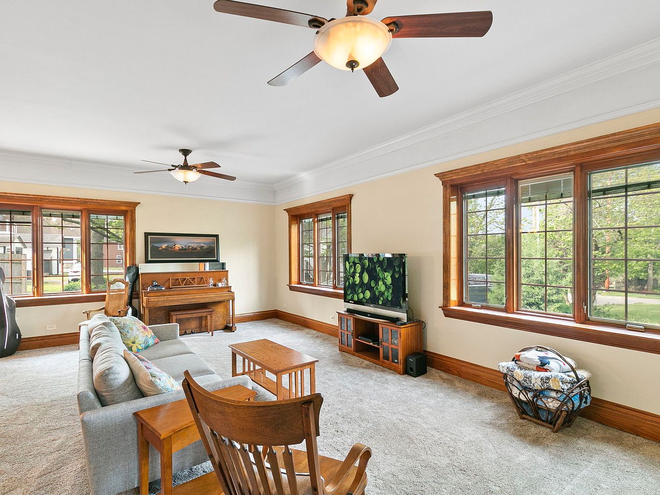 This living room features a well-balanced layout with a comfortable gray sofa and wooden side tables positioned centrally on a plush carpet. Natural light floods the space through multiple large windows framed with warm wooden trims, enhancing the airy feel. A wooden rocking chair faces the seating area, adding a classic touch. The room is punctuated by two ceiling fans with wooden blades, aiding ventilation while blending with the traditional wood finishes seen on window frames, baseboards, and furniture. The space includes a piano and a TV console, promoting both relaxation and entertainment within a cozy, inviting atmosphere.