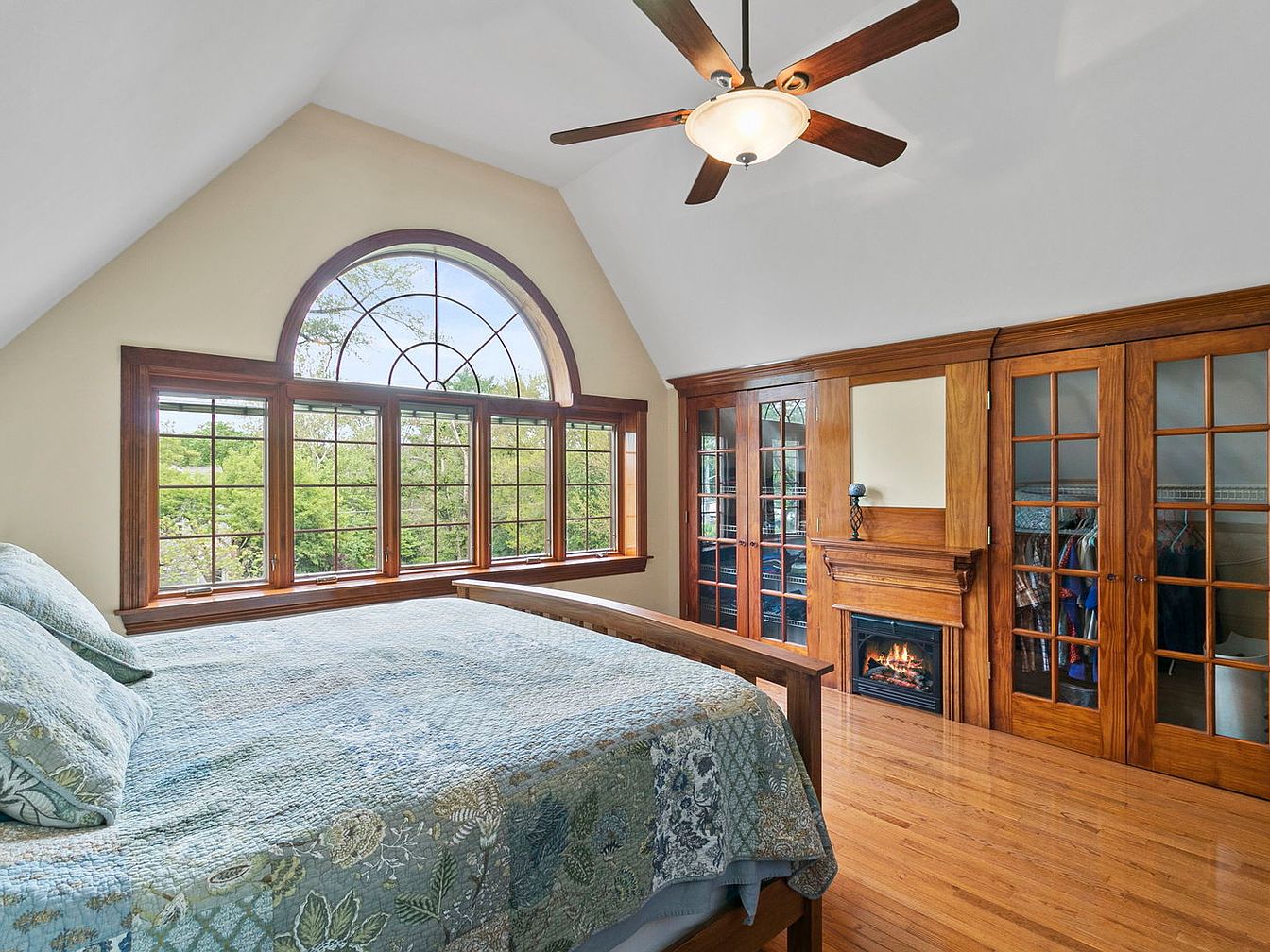 This master bedroom impresses with its vaulted ceiling, giving the space an open, airy feel. A striking arched window framed in rich wood dominates the far wall, allowing abundant natural light to pour in and offering serene views of the greenery outside. The wooden furniture, including the bed frame and built-in wardrobe doors with glass panes, echoes classic craftsmanship and warmth. The polished hardwood floors complement the wood tones throughout, while a cozy fireplace inset into a wooden mantle adds a touch of elegance and comfort. Soft, muted blues on the bedding enhance the tranquil atmosphere.