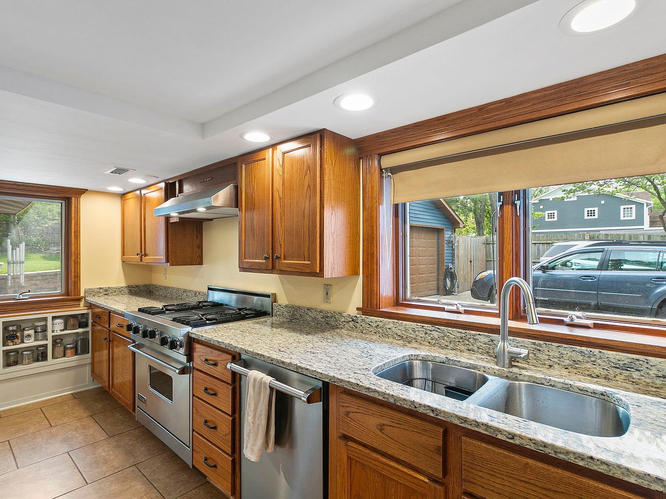 This kitchen features warm wooden cabinetry paired with granite countertops in a neutral mix of beige and gray tones. The straight layout offers ample counter space, including a double stainless steel sink positioned under a large window equipped with a beige roller shade, inviting natural light and an outdoor garden view. The stainless steel stove with a vent hood adds a modern touch, complemented by a dishwasher with a towel bar handle. Recessed lighting fixtures in the ceiling ensure bright, even illumination. The flooring is tiled in a warm brown tone, enhancing the cozy and practical ambiance of the space.