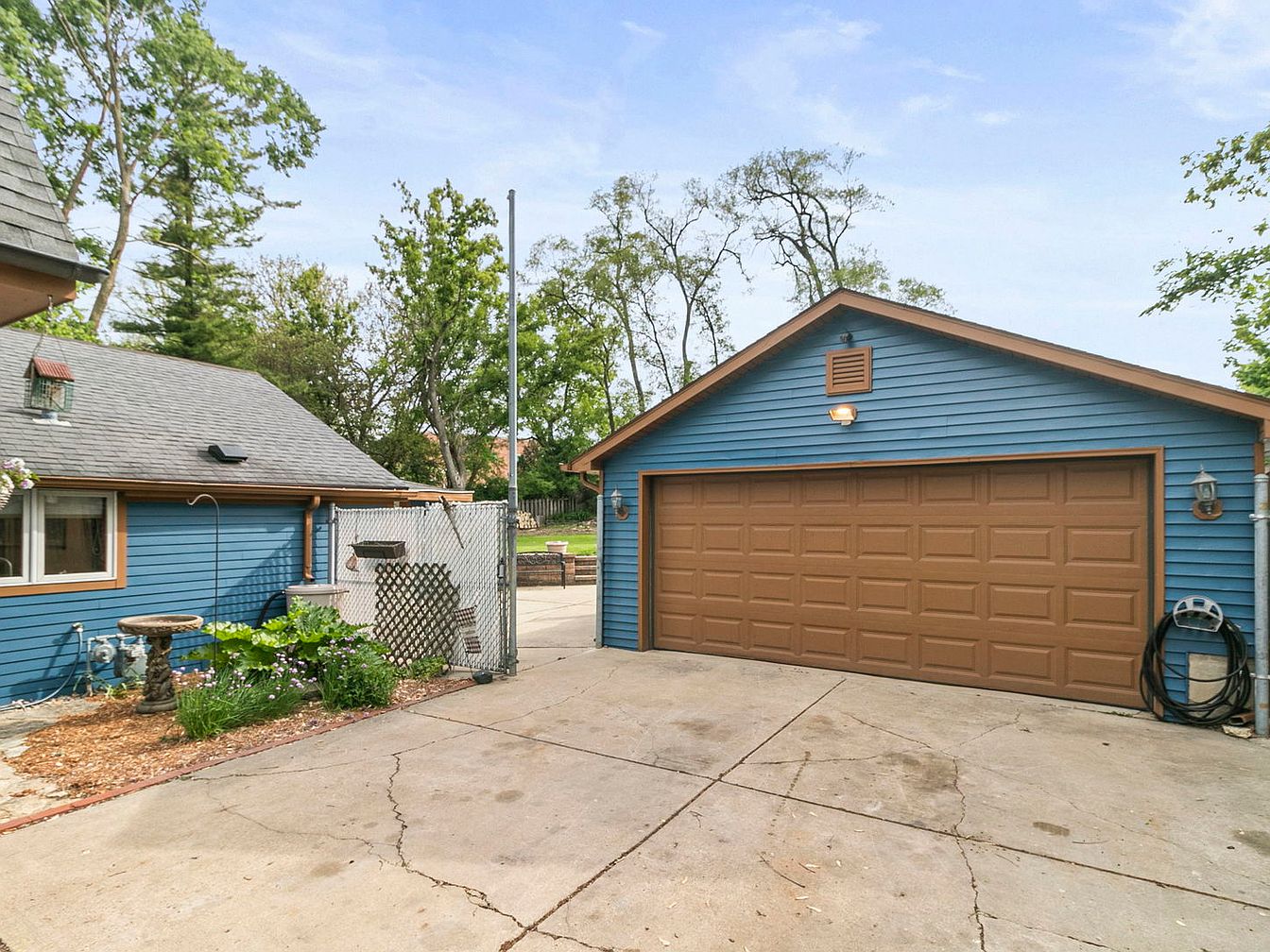 This outdoor space features a spacious concrete driveway leading to a detached two-car garage painted in a calming blue with brown trim and garage door, creating a cohesive, earthy color palette. Adjacent to the garage is a smaller blue-painted structure with a shingled roof. A quaint garden bed with green foliage and small flowers adds liveliness near a decorative bird bath. A metal chain-link gate separates the driveway from a backyard area, bordered by mature trees and shrubs, lending privacy and a natural backdrop. Practical elements such as a hose and gas meters blend into the functional yet inviting exterior space.