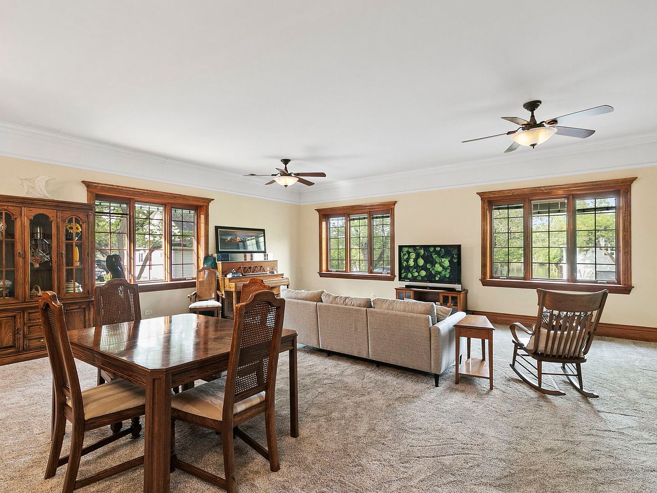 This inviting living and dining space features a neutral beige carpet that adds warmth underfoot, complemented by cream-colored walls and rich wood trim around the large, multi-pane windows. The dining area holds a classic wooden table paired with four matching chairs, exhibiting a timeless design with cane backing. The living area is anchored by a light gray sectional sofa, positioned towards a wooden TV stand supporting a flat-screen television. A traditional wooden rocking chair adds charm beside the sofa. Ceiling fans with light fixtures provide both air circulation and accent lighting. A vintage piano and an elegant china cabinet enrich the traditional ambiance, enhancing the room’s cozy yet classic appeal.