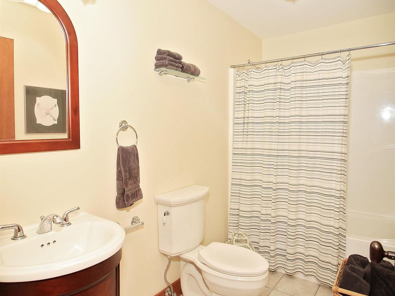 This bathroom features a clean and inviting design with soft cream-colored walls creating a warm atmosphere. A white porcelain sink with a rich wood-toned vanity base is accentuated by a large arched mirror framed in polished wood. The white toilet is positioned adjacent to the vanity, complementing the neutral palette. Above it, a glass shelf holds neatly folded dark gray towels, matched by a hand towel hanging on a chrome ring. The bathtub is enclosed by a subtly striped beige and white shower curtain, tying the space together with understated elegance. The floor is tiled in a neutral tone, enhancing the fresh and simple aesthetic.