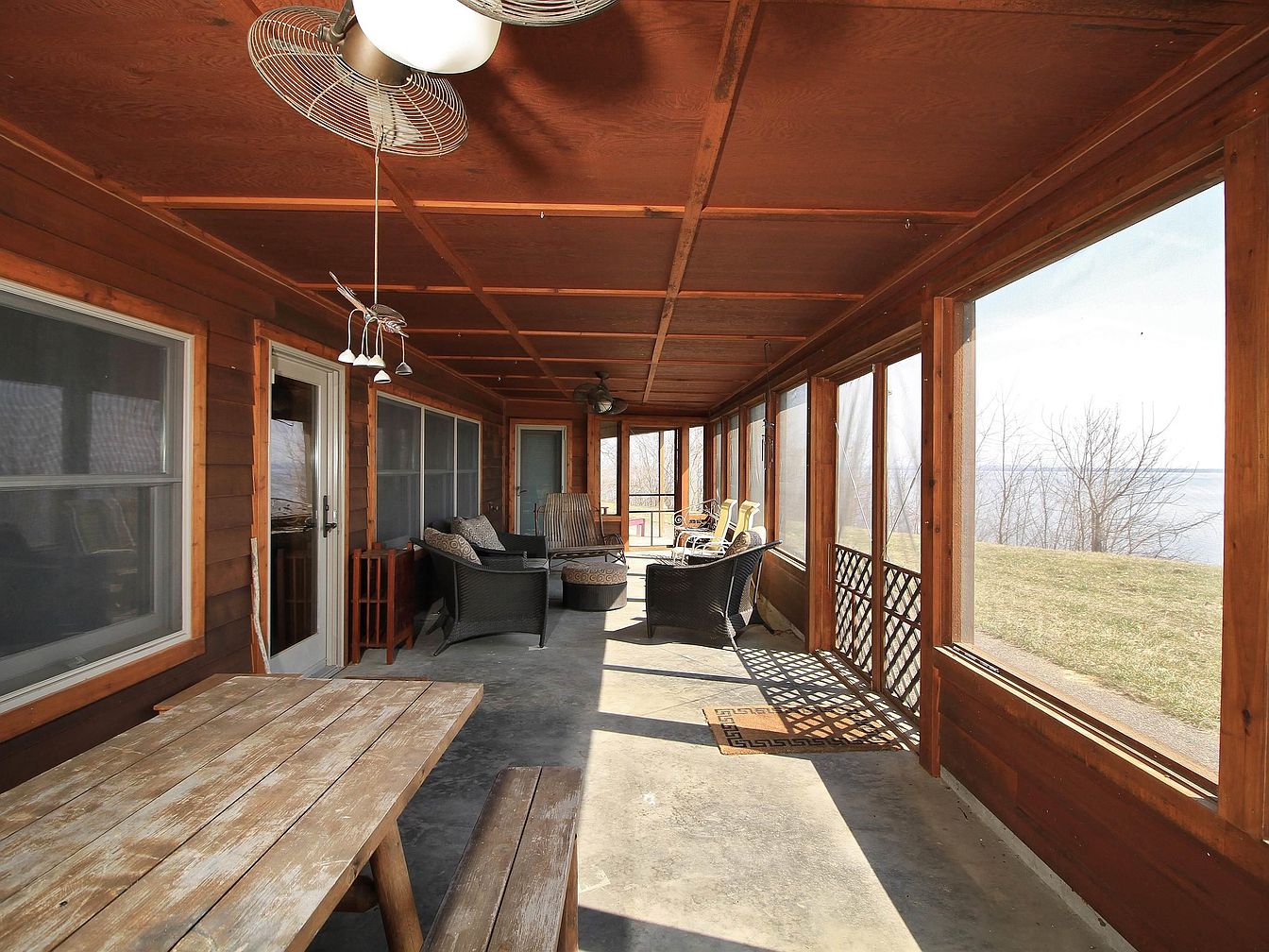 This screened porch offers a cozy outdoor retreat with a rustic charm. Wood paneling covers the ceiling and walls, lending warmth and texture to the space, while multiple windows framed in wood allow ample natural light and offer expansive views of the lawn and waterfront beyond. A weathered wooden picnic table with bench seating is positioned near the entrance, inviting casual gatherings. The seating area features several black wicker armchairs accented with patterned cushions set around a small ottoman, complemented by ceiling fans overhead for air circulation. Concrete flooring adds a durable, practical touch to this inviting sunroom-like extension of the home.