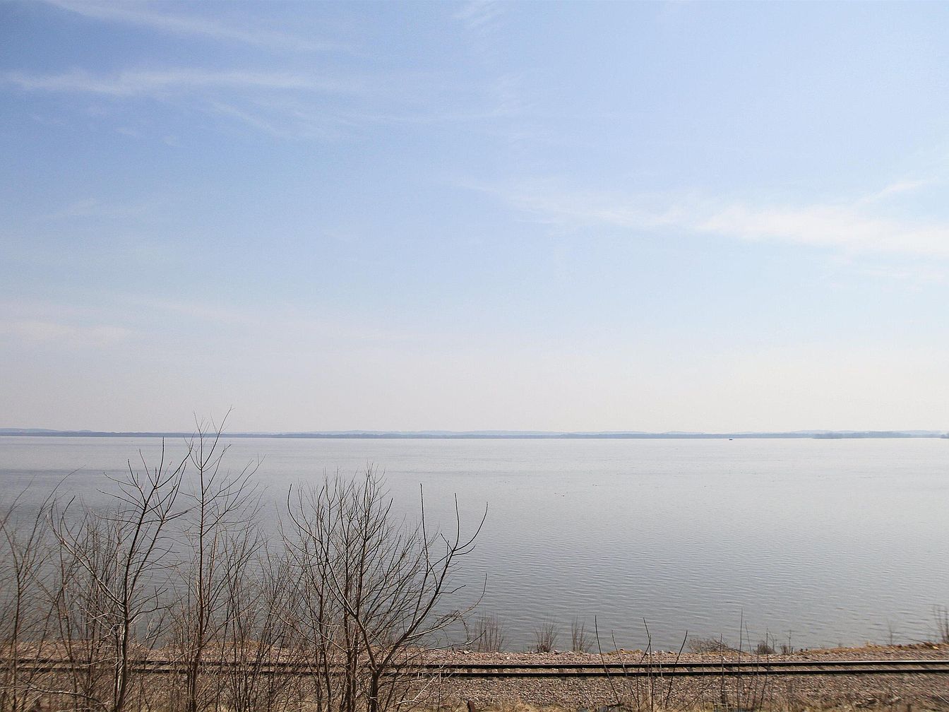 This serene outdoor scene captures an expansive waterbody stretching to the horizon under a soft, pastel sky. The gentle ripples on the lake give a sense of peaceful motion, complemented by the light blue and muted gray tones in the water and sky. In the foreground, leafless thin branches and low vegetation frame the view, offering a natural textural contrast. A set of railroad tracks runs parallel to the water’s edge, adding a subtle linear element and hinting at connection and travel. This tranquil vantage point invites quiet reflection and appreciation of nature’s calm beauty.