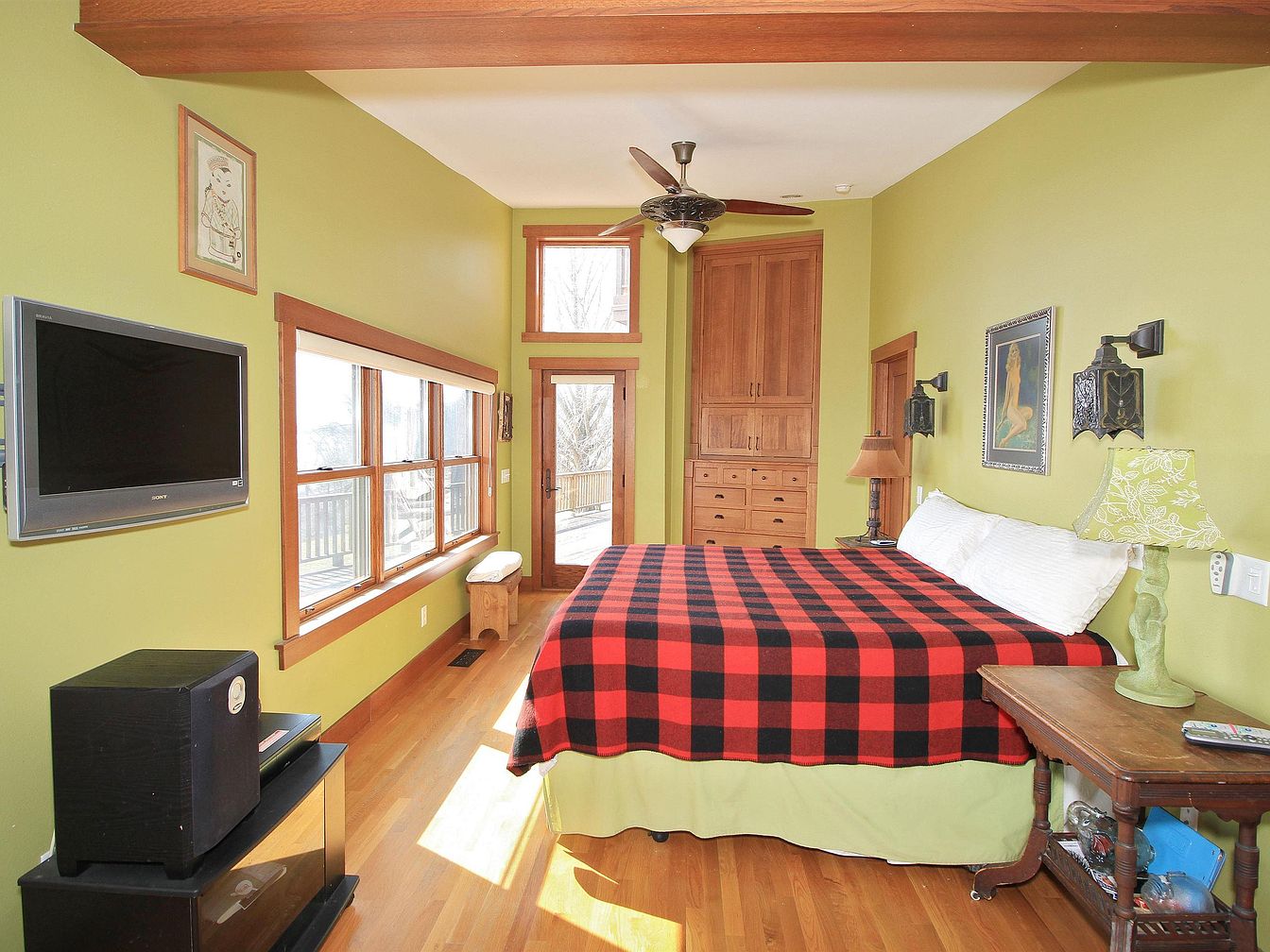 This bedroom features a warm and inviting atmosphere with light green walls complemented by natural wood trim and furniture. A large window with wide wooden framing allows abundant sunlight to fill the space, highlighting the honey-toned hardwood floor. The bed is dressed in a bold red and black checkered blanket set atop a pale green bed skirt, making the centerpiece inviting and cozy. Flanking the bed are wall-mounted ornate sconces, and a vintage wooden side table holds a lamp with a floral-patterned shade. Toward the back, built-in cabinetry in rich wood tones provides ample storage, while a glass door opens outward to a balcony, bringing the outside in and enhancing the room’s serene feel. A ceiling fan with dark wooden blades adds both style and functionality to the space.