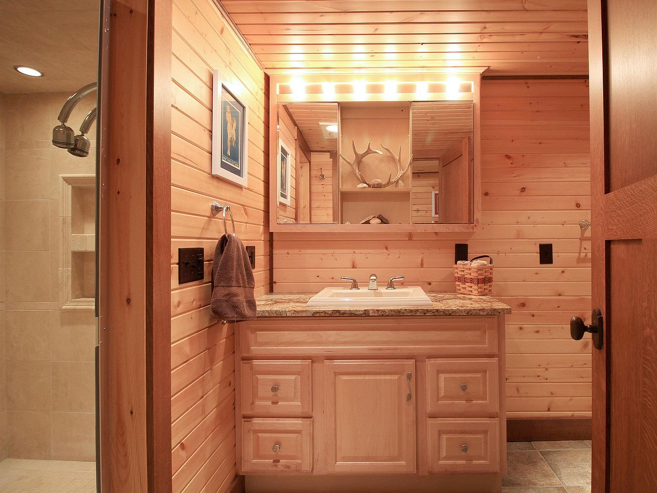 This bathroom vanity area features warm, natural wood paneling covering the walls and ceiling, creating a cozy, cabin-like ambiance. The wooden vanity has a granite countertop with a white rectangular sink centered underneath a wide mirror. Above the mirror, bright, modern vanity lights illuminate the space effectively. A towel ring with a brown towel hangs on the left side, complementing the earthy tones. On the countertop, a small woven basket holds white rolled towels, enhancing the rustic yet tidy aesthetic. To the left, a glimpse of a beige tiled shower area adds contrast, merging natural and practical elements seamlessly.