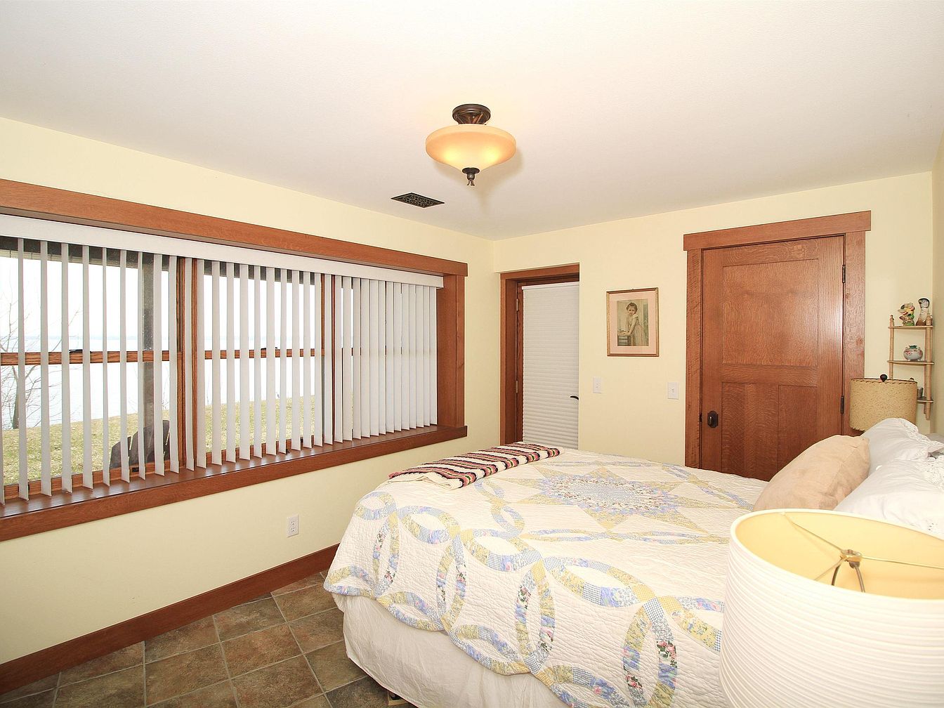 This inviting bedroom features a lovely blend of warm wood tones and soft neutrals, creating a cozy and calm atmosphere. The bed is dressed with a charming patchwork quilt that adds a touch of vintage charm. A large window with vertical blinds allows natural light to filter in while framing a scenic view outside. Wood trim around the window, door, and baseboards enhances the room’s classic craftsman style. The ceramic tile flooring offers easy maintenance and complements the earthy color palette. A ceiling light fixture illuminates the space, while wall art and a bedside lamp add subtle decorative touches.