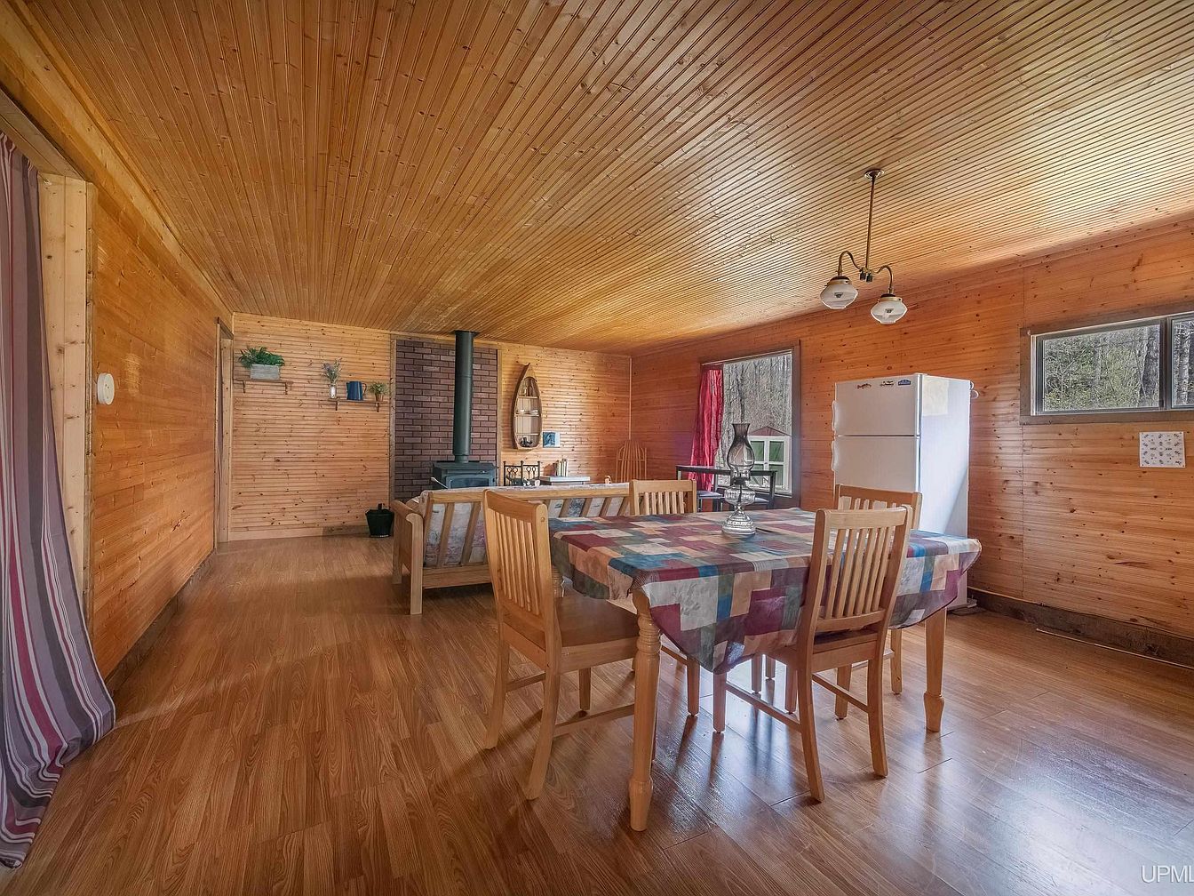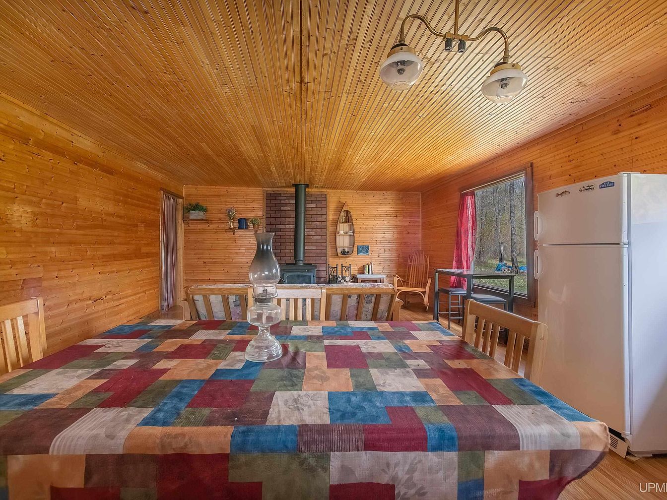This inviting open-concept space blends dining and living areas within warm, natural wood paneling covering walls and ceiling, creating a cozy cabin atmosphere. A large table with a colorful patchwork tablecloth anchors the dining zone, surrounded by wooden chairs that enhance the rustic charm. The wood stove against a brick backdrop offers both warmth and focal interest to the living section, complemented by simple wooden furniture and small decorative shelves. Ample natural light enters through a sizeable window dressed with a vibrant red curtain, providing scenic outdoor views and balancing the earthy tones with a splash of color.