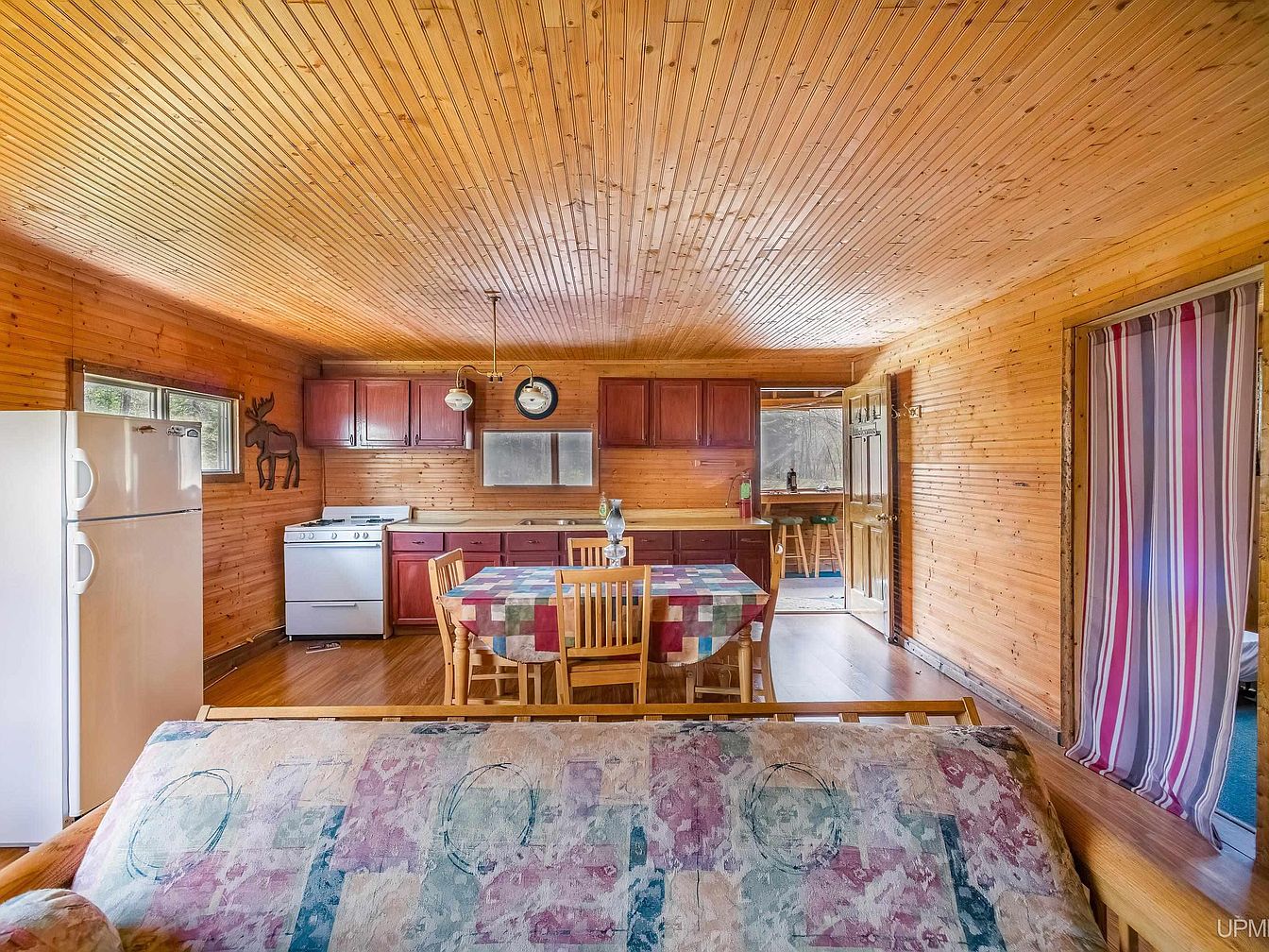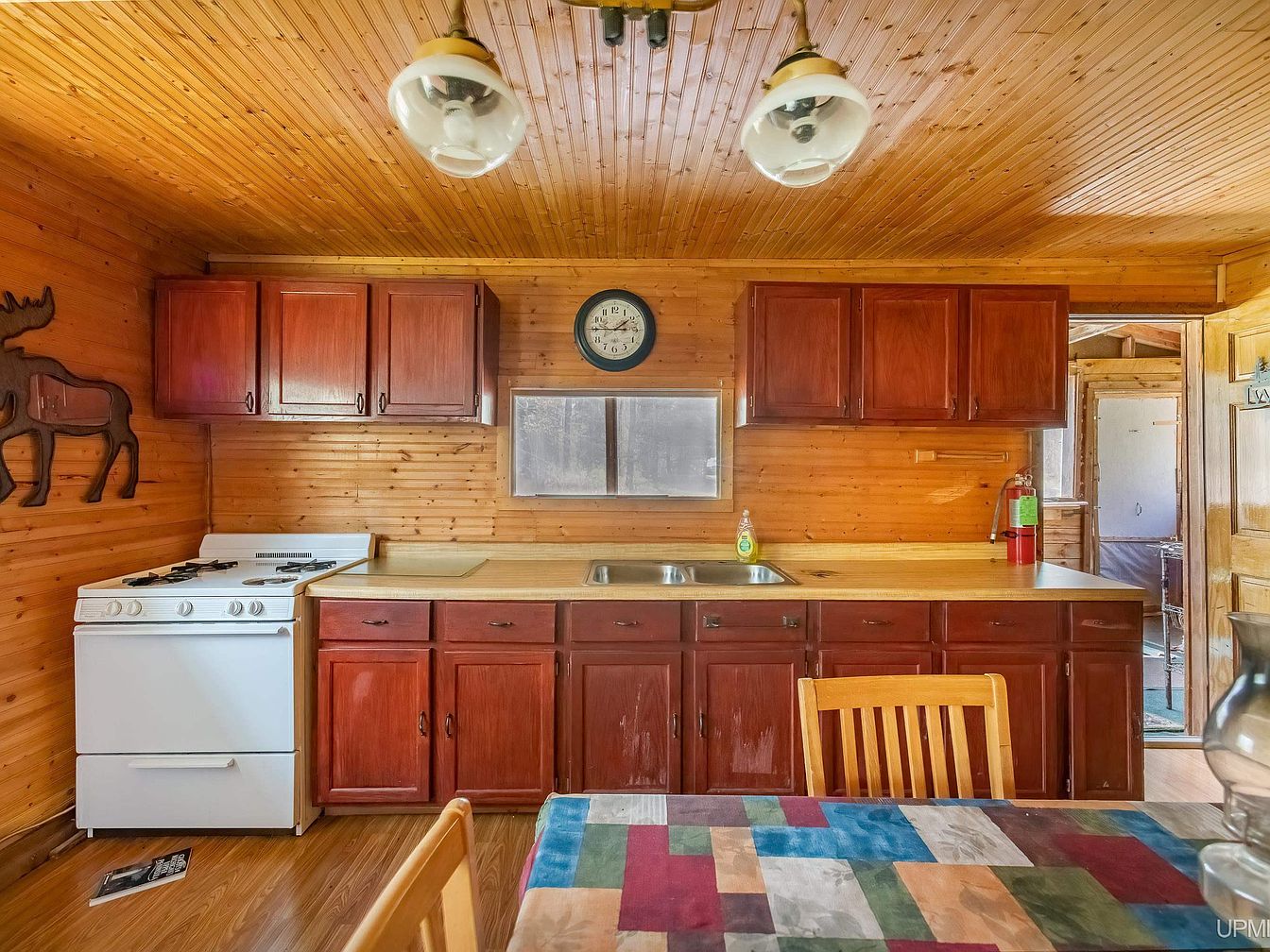 This kitchen exudes rustic charm with its wood-paneled walls and ceiling, creating a warm, inviting atmosphere. Rich, reddish-brown cabinetry lines the upper and lower areas, complementing the natural wood tones throughout. The white stove on the left contrasts softly with the wood, offering a practical cooking area next to a beige countertop with a double sink beneath a small window. Light fixtures with globe bulbs hang overhead, while a colorful patchwork tablecloth adds vibrant, cozy detail to the space. An artistic wooden moose adorns one wall, enhancing the cabin’s nature-inspired aesthetic.