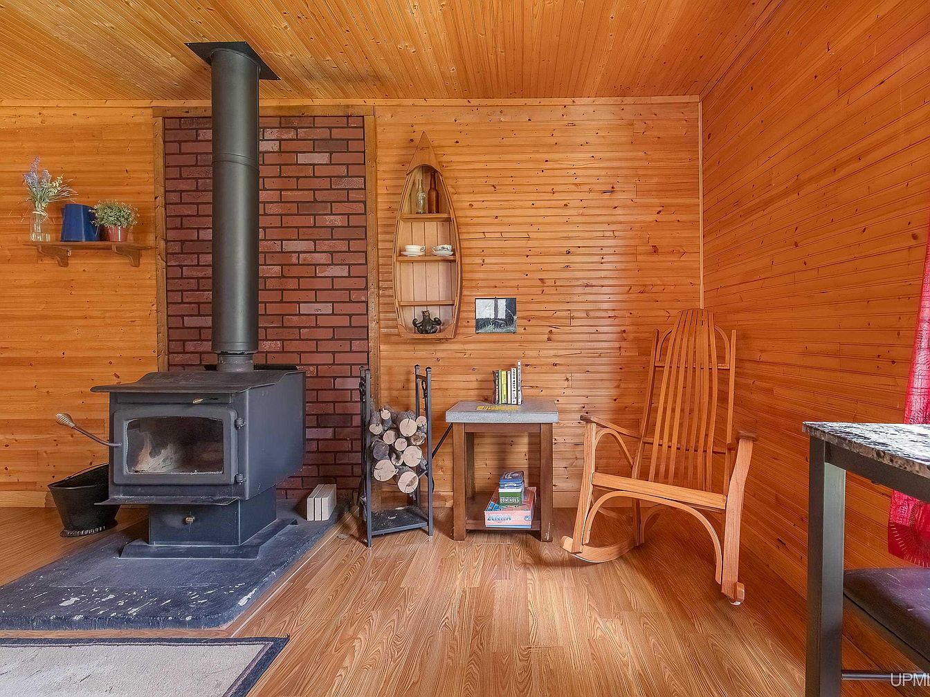 This warm and inviting corner features a prominent black wood-burning stove set against a brick backdrop, serving as the room’s focal point. The walls, ceiling, and floor boast harmonious wooden paneling and planks in honey tones, enhancing the rustic cabin vibe. To the right, a classic wooden rocking chair complements the natural wood textures, ideal for relaxation. A small wooden side table holds books with additional storage underneath, adding charm and practicality. Above, a canoe-shaped wall shelf displays small decorative pieces, while a floating shelf with potted plants and a blue pitcher lends touches of greenery and color for a peaceful, homey atmosphere.