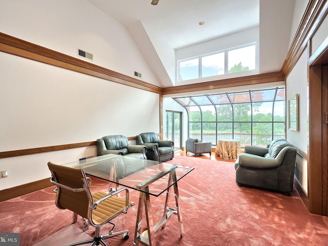 This inviting sunroom is designed for both relaxation and casual gatherings, featuring a combination of plush leather armchairs and a compact grey armchair strategically placed near the expansive screened windows. The room is accented by a warm, deep rose carpet that contrasts subtly with the cream-colored walls and medium-toned wood trim running along the mid-wall and ceiling edges. Abundant natural light floods the space through the large, multi-pane upper windows and the curved glass enclosure overlooking serene greenery beyond. A modern glass desk with a tan upholstered office chair adds functional versatility while maintaining the airy atmosphere. The vaulted ceiling enhances the spacious feel, blending comfort with a connection to the outdoors.