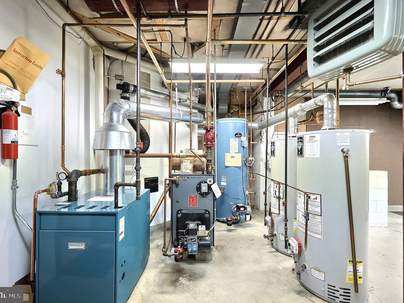 This utility space is designed to house essential mechanical systems with functionality as the priority. The layout features an organized array of water heaters, boilers, and associated piping centered neatly along the walls, allowing clear access for maintenance. Copper pipes create a network overhead and along the walls, contrasting with the neutral off-white cinder block walls and grey concrete flooring. Bright fluorescent lighting ensures the area is well illuminated, exposing the clean, industrial look. The ceiling reveals exposed beams and additional piping, enhancing utilitarian aesthetics while emphasizing practicality and efficient use of space.