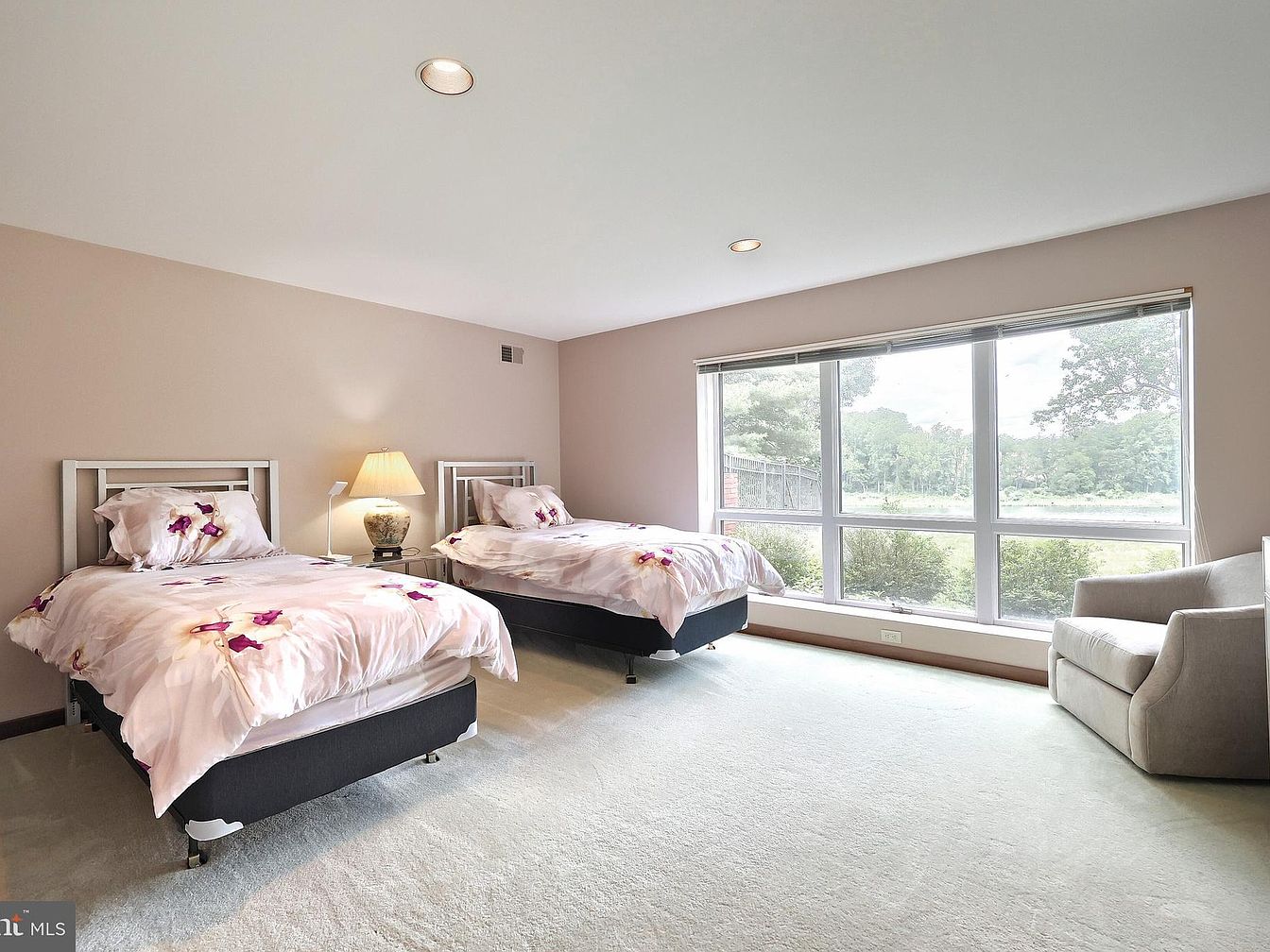 This guest bedroom features a serene and inviting atmosphere with two twin beds dressed in white bedding adorned with pink floral patterns. Positioned side by side, the beds are separated by a small nightstand holding a classic lamp with a beige shade, which adds warmth to the space. The walls are painted in a soft, muted taupe, harmonizing with the light-colored carpet flooring. Floor-to-ceiling windows dominate one wall, allowing abundant natural light to fill the room and offering scenic views of lush greenery outside. A cozy beige armchair near the window provides a quiet reading nook or relaxation spot, balancing comfort and simplicity in this airy, well-lit space.