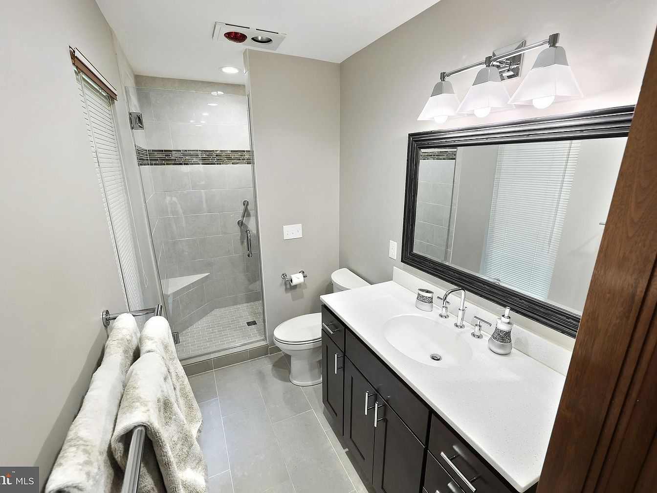 This bathroom features a modern design with a neutral color palette dominated by soft gray walls and light gray floor tiles. The vanity stands out with its dark wood cabinetry topped by a sleek white countertop that houses an integrated oval sink. Above the sink, a large rectangular mirror framed in dark trim perfectly complements the cabinetry, illuminated by a trio of contemporary light fixtures with frosted glass shades. On the left, a glass-enclosed walk-in shower is tiled in light gray with a horizontal decorative mosaic band, showcasing a built-in corner seat and a chrome shower handle, enhancing both style and function.