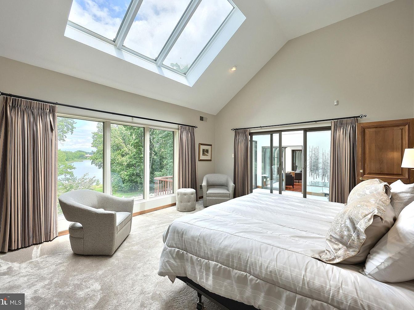 This master bedroom features a serene and airy atmosphere with high vaulted ceilings and a large skylight that floods the space with natural light. The soft beige walls and plush carpet complement the neutral-toned bedding and seating area, which includes a cozy armchair and a small ottoman near expansive floor-to-ceiling windows showcasing a lush outdoor view with water. Curtains frame both sets of windows, adding warmth and texture. Sliding glass doors lead to an adjoining room, enhancing the open, connected feel of the space with subtle wooden accents adding a touch of classic refinement.