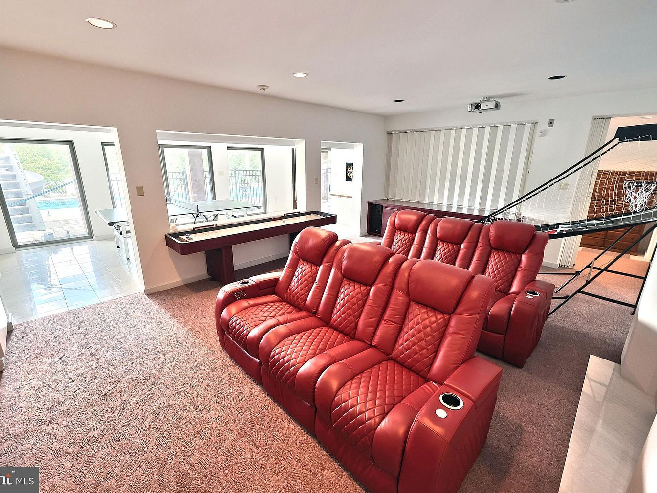 This spacious entertainment room features plush, quilted red leather recliners arranged in two rows, providing comfortable seating for multiple viewers. The carpeted floor complements the warm tones of the chairs, enhancing coziness. Large windows and open doorways allow natural light to flow between adjacent spaces, creating an airy feel. A shuffleboard table and a basketball arcade game are positioned nearby, emphasizing the dual purpose of relaxation and recreation. Neutral white walls and recessed ceiling lights keep the room bright and modern, while vertical blinds offer privacy control in this multifunctional entertainment haven.