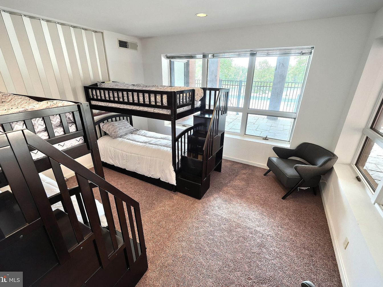 This cozy bedroom features a set of dark wood bunk beds with a staircase for easy access to the top bunk, combining functionality with a modern touch. The beds are dressed in soft neutral bedding with subtle patterned pillows, complementing the off-white walls. The room is carpeted in a muted beige tone that adds warmth and comfort. A single, stylish black armchair is positioned near a large window that floods the space with natural light, offering a peaceful view of the outdoors. The minimalist design emphasizes clean lines and a practical layout for a children’s sleeping area.