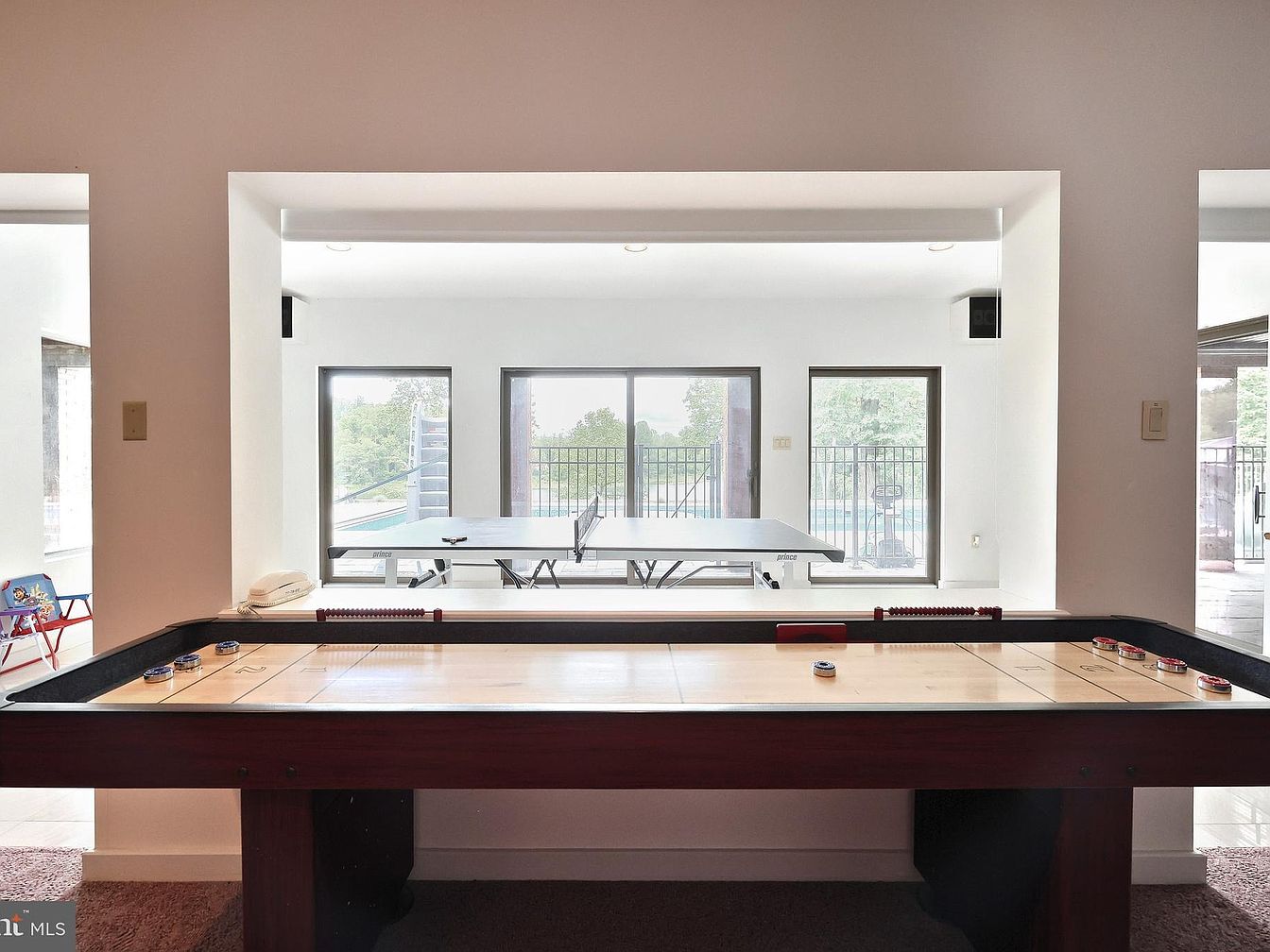 This cozy game room features a shuffleboard table positioned in the foreground, serving as the focal point of the space. Beyond the large rectangular pass-through opening in the wall, a ping pong table is visible, framed by three floor-to-ceiling sliding glass doors that flood the area with natural light. The room boasts a neutral palette with white walls and muted earthy tones on the adjacent wall, complemented by plush carpeting underneath. The clean lines and minimalistic design create a relaxed, inviting atmosphere, perfect for leisure and entertaining. The outdoor pool area glimpsed through the windows adds to the recreational vibe of the home.