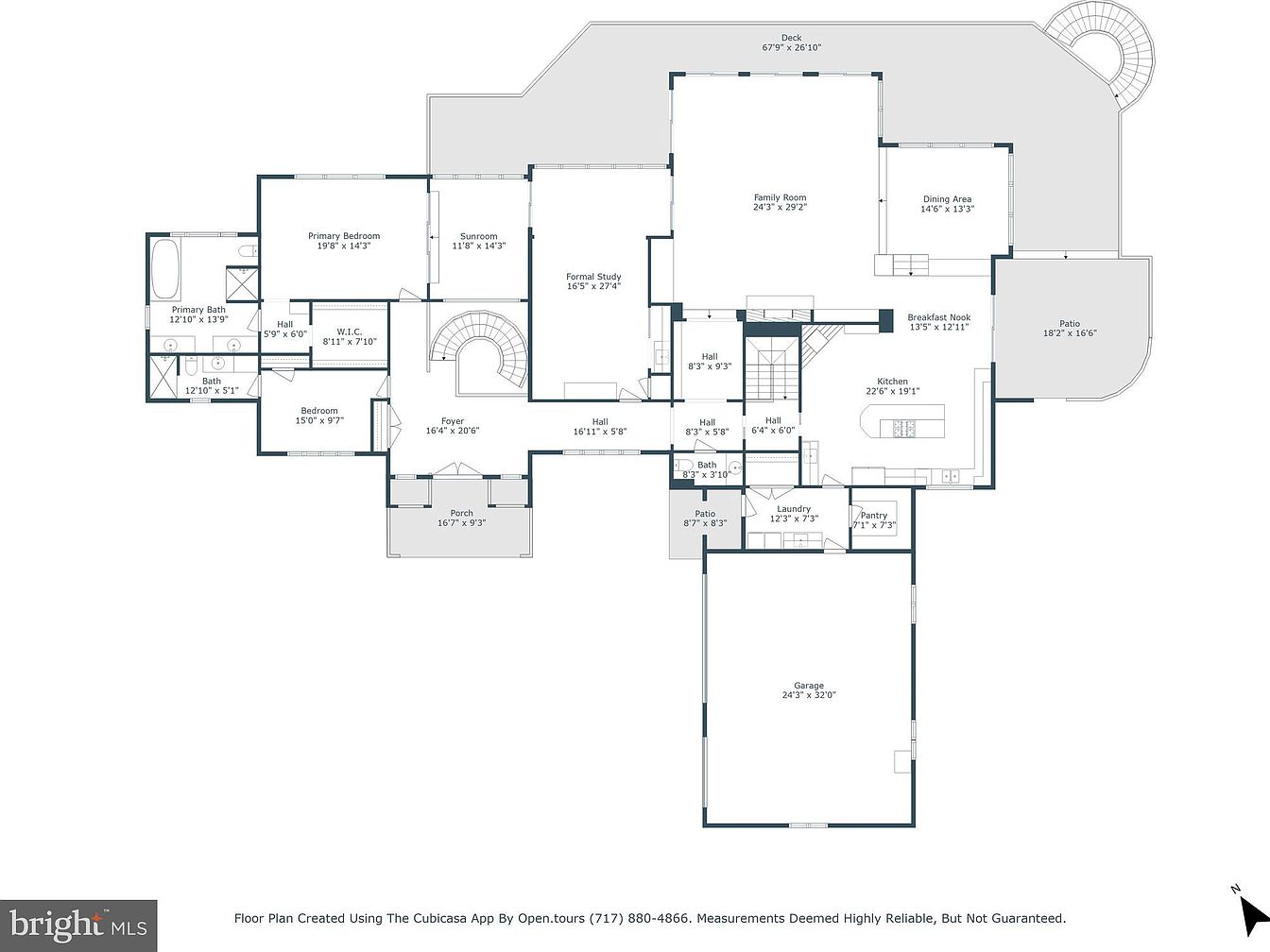 This detailed floor plan showcases a spacious one-story home layout featuring a large family room that opens to a deck at the back. The kitchen, complemented by a breakfast nook, flows into a formal dining area and a pantry for ample storage. The home’s primary bedroom includes a walk-in closet and an ensuite bath. A formal study is located near the foyer, which serves as the home’s entry point with a curved staircase. Other notable features include a sunroom, additional bedrooms and bath, laundry room, and a large garage, all designed with clear, efficient circulation pathways.