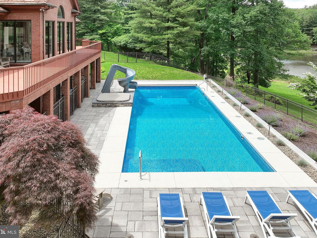 This expansive outdoor pool area features a large rectangular swimming pool with crystal-clear blue water, bordered by light-colored concrete coping. Alongside the pool, six modern, white-framed lounge chairs with blue cushions offer ample relaxation space. Adjacent to the pool is a light gray paved patio with a curved water slide adding a playful touch. The pool area is framed by a lush green lawn and a backdrop of mature trees, providing natural privacy. A long brick house with large windows and a spacious upper balcony runs along one side, complementing the serene, resort-style atmosphere.